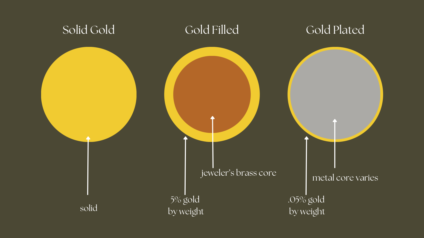 Gold-filled metal is created by bonding a thick layer of 14karat gold to a base metal (jeweler’s brass) using heat and pressure. The result is a product that is much more durable than gold plating and is designed to last for years. The metal is made up of 58.5% pure gold, which gives it the beautiful, lustrous finish you can only find in gold. Our pieces are made to the highest quality standards and are crafted to look great, and stand up to everyday wear.